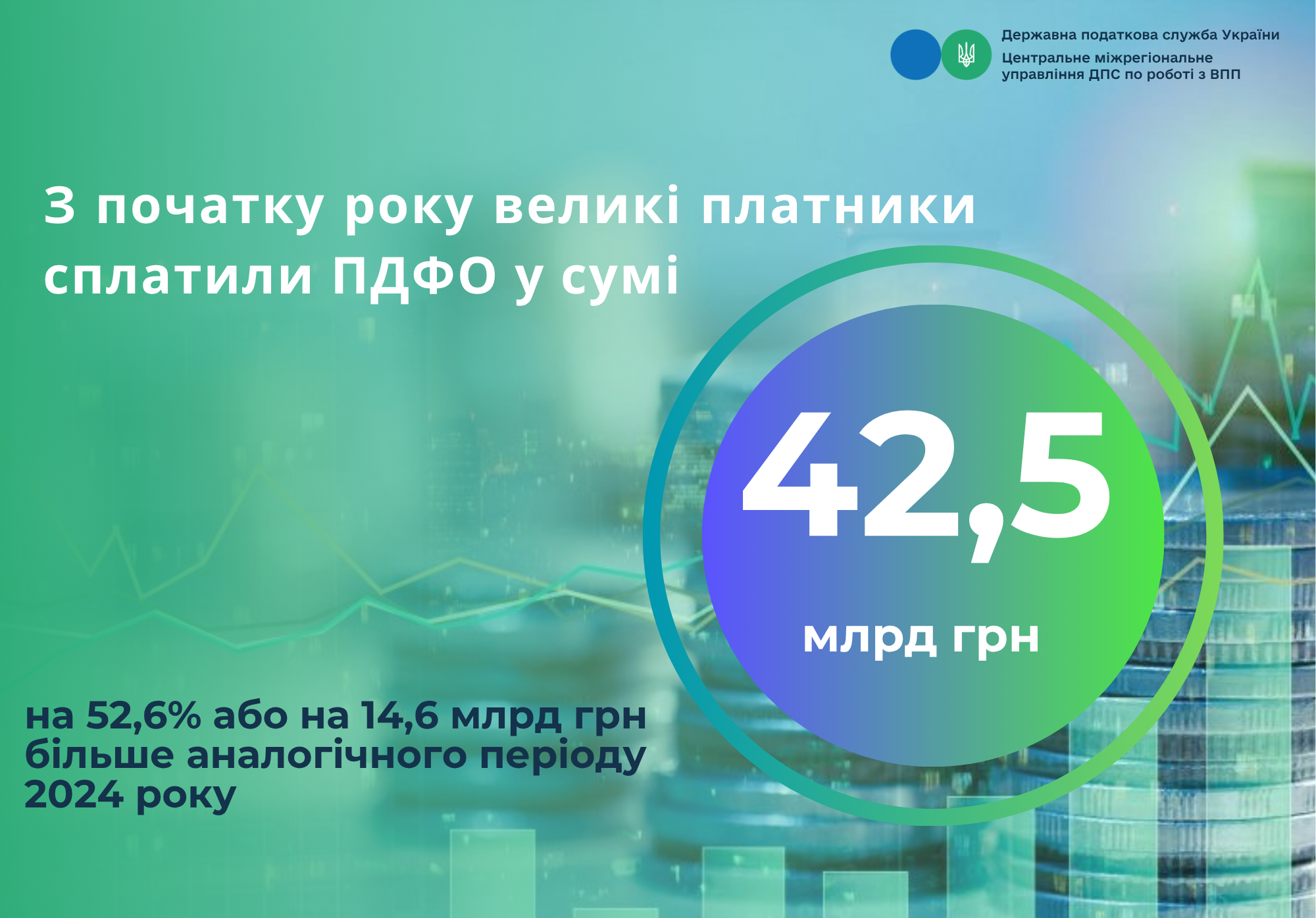 Платники Центрального міжрегіонального управління ДПС по роботі з великими платниками податків протягом січня-жовтня 2025 року спрямували до загального фонду держбюджету 42,5 млрд грн податку з доходів фізичних осіб із заробітної плати. Порівняно з минулорічними показниками надходження ПДФО зросли на 14,6 млрд грн або на 52,6 %.