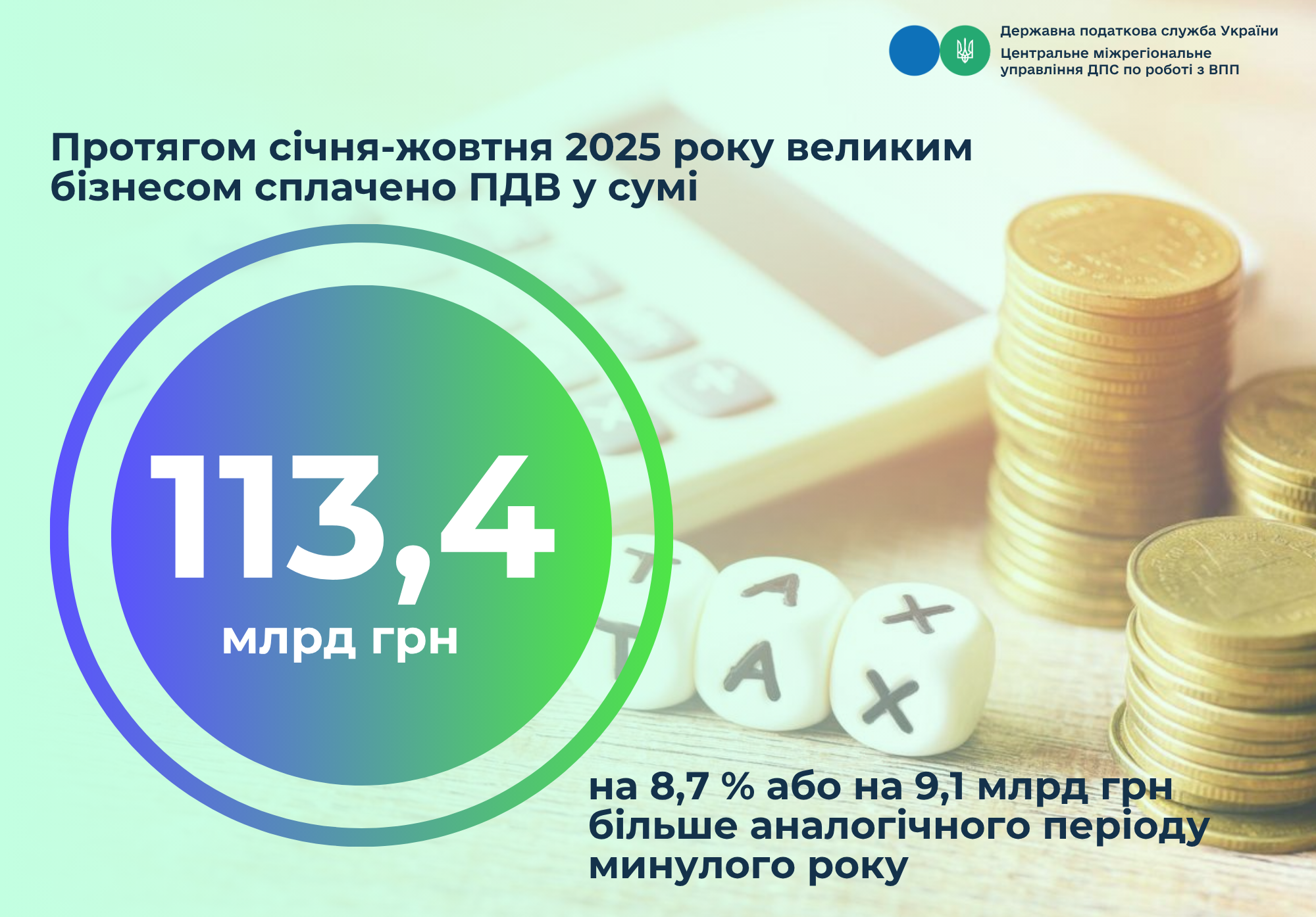 З початку поточного року платниками Центрального міжрегіонального управління ДПС по роботі з великими платниками податків до державного бюджету спрямовано 113,4 млрд грн податку на додану вартість. Це більше на 9,1 млрд грн, або 8,7 відс. ніж за 10 місяців 2024 року.   Зокрема, у жовтні надходження з ПДВ склали 8,7 млрд гривень.