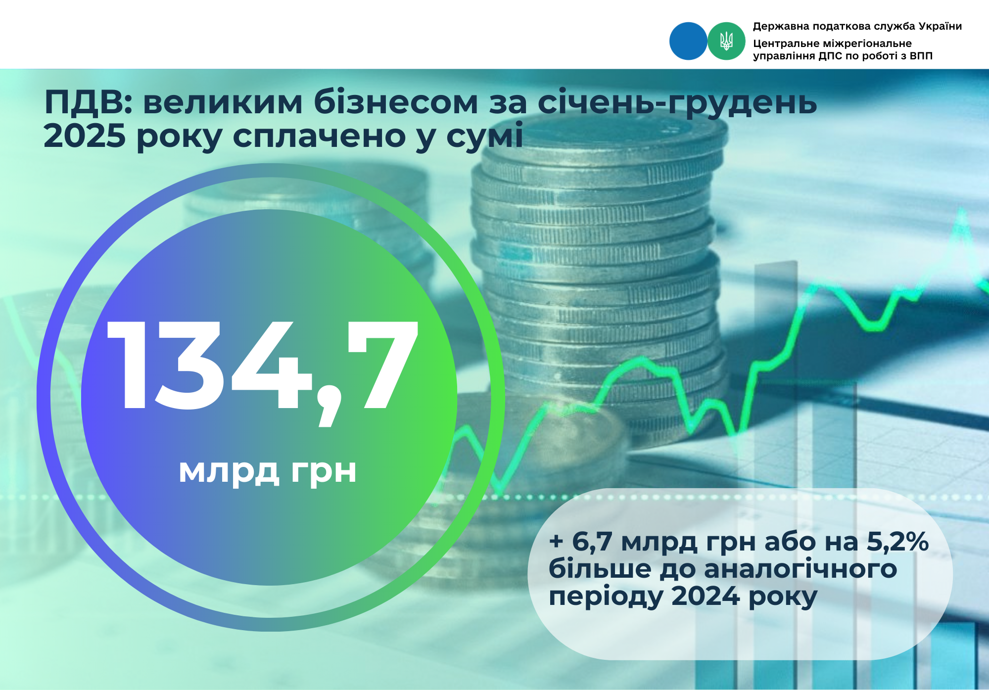 За січень-грудень року платниками Центрального міжрегіонального управління ДПС по роботі з великими платниками податків до державного бюджету спрямовано 134,7 млрд грн податку на додану вартість. Це більше на 6,7 млрд грн, або 5,2 відс. ніж за 12 місяців 2024 року.  Зокрема, у грудні надходження з ПДВ склали 11,3 млрд гривень.