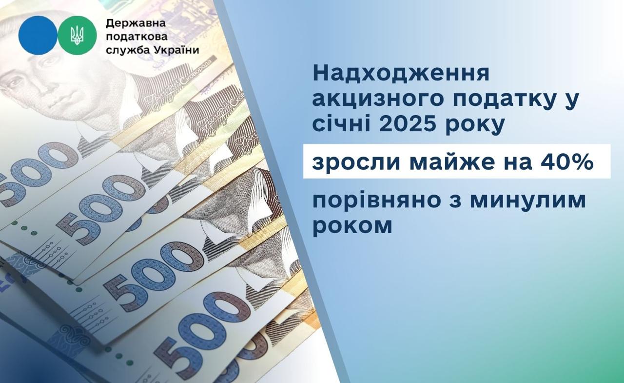 У січні 2025 року до загального фонду державного бюджету надійшло 9,3 млрд грн акцизного податку з вироблених та ввезених підакцизних товарів. Це на 39,9 % (2,6 млрд грн) більше, ніж у січні 2024 року.
