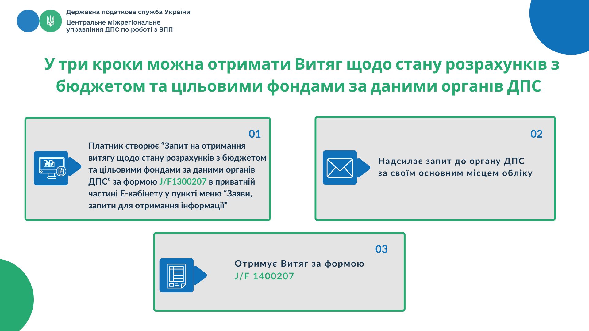 1.Платник створює «Запит про отримання витягу щодо стану розрахунків з бюджетами та цільовими фондами за даними органів ДПС» (далі - Запит) за формою «J/F1300207» в приватній частині електронного кабінету у пункті меню «Заяви, запити для отримання інформації» шляхом: