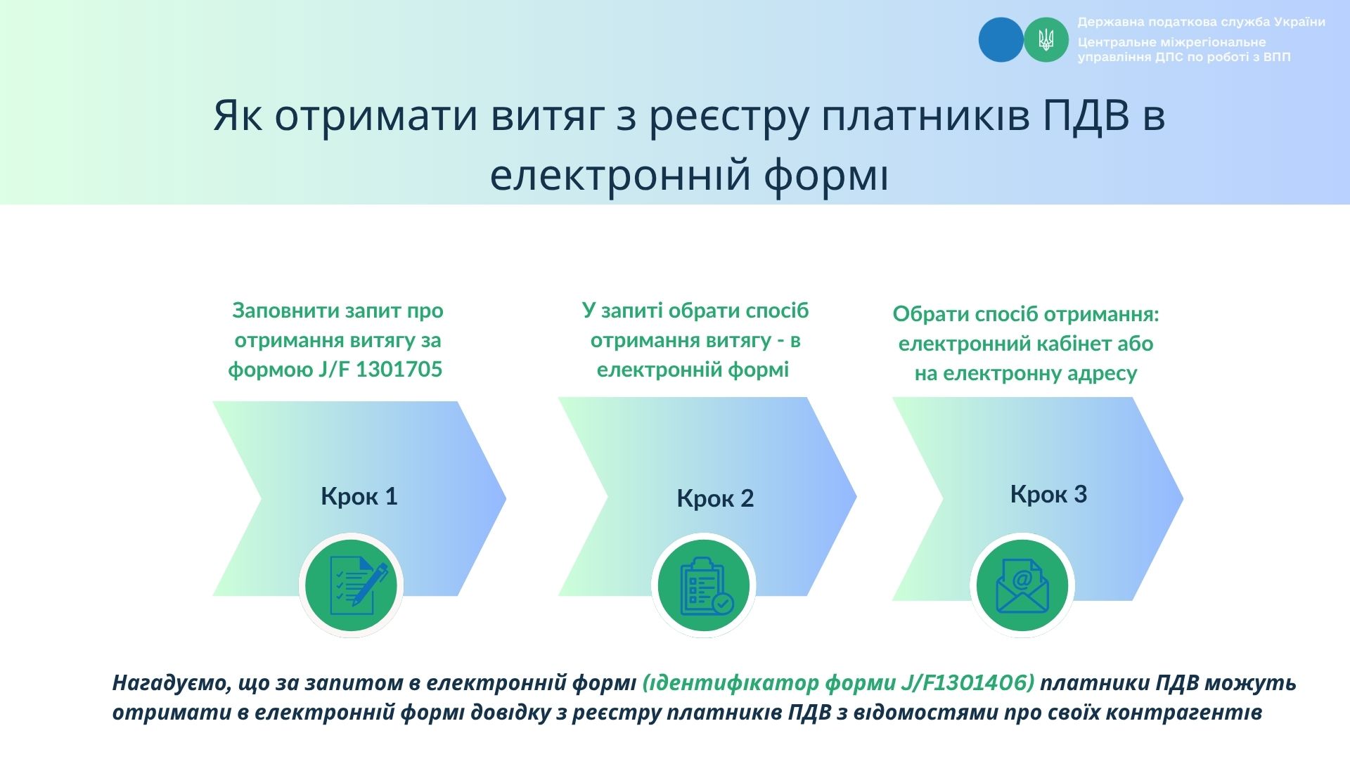 Центральне міжрегіональне управління по роботі з великими платниками податків нагадує про оновлення форми запиту про отримання витягу з реєстру платників ПДВ (ідентифікатор форми J/F1301705). У запиті можна зазначити новий спосіб отримання витягу – в електронній формі.
