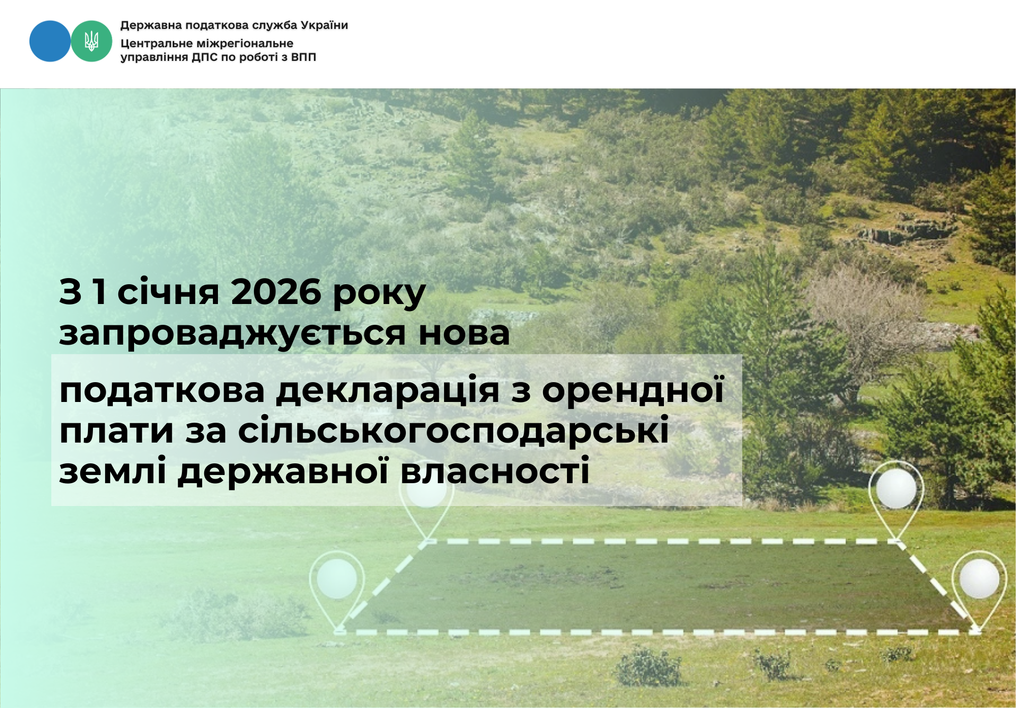 Центральне міжрегіональне управління ДПС по роботі з великими платниками податків нагадує, що з 1 січня 2026 року запроваджується нова форма податкової декларації з орендної плати для земельних ділянок сільськогосподарського призначення державної власності.