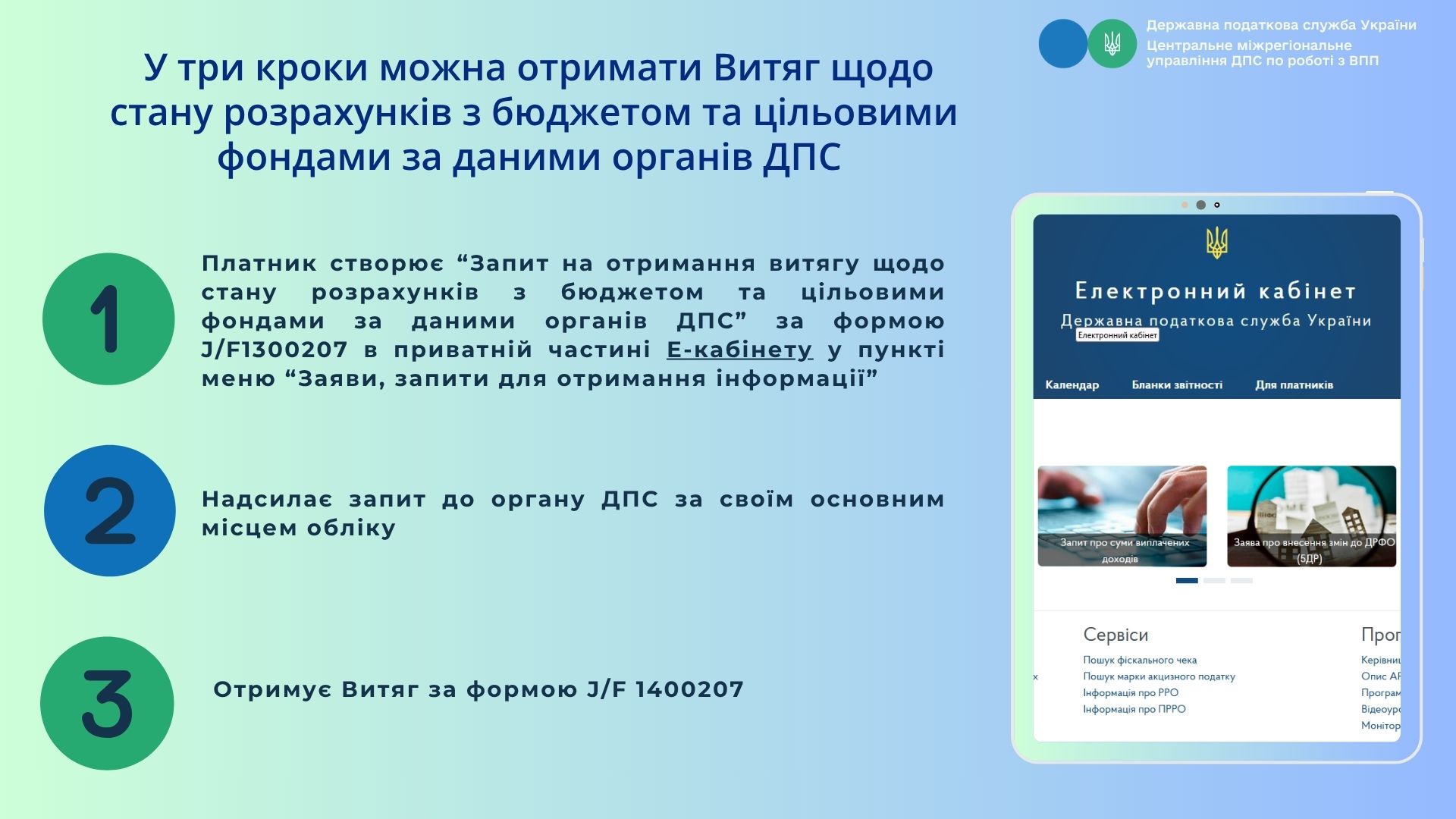 Одночасно повідомляємо, що ДПС України надано покроковий алгоритм дій для платників у отриманні Витягу щодо стану розрахунків: