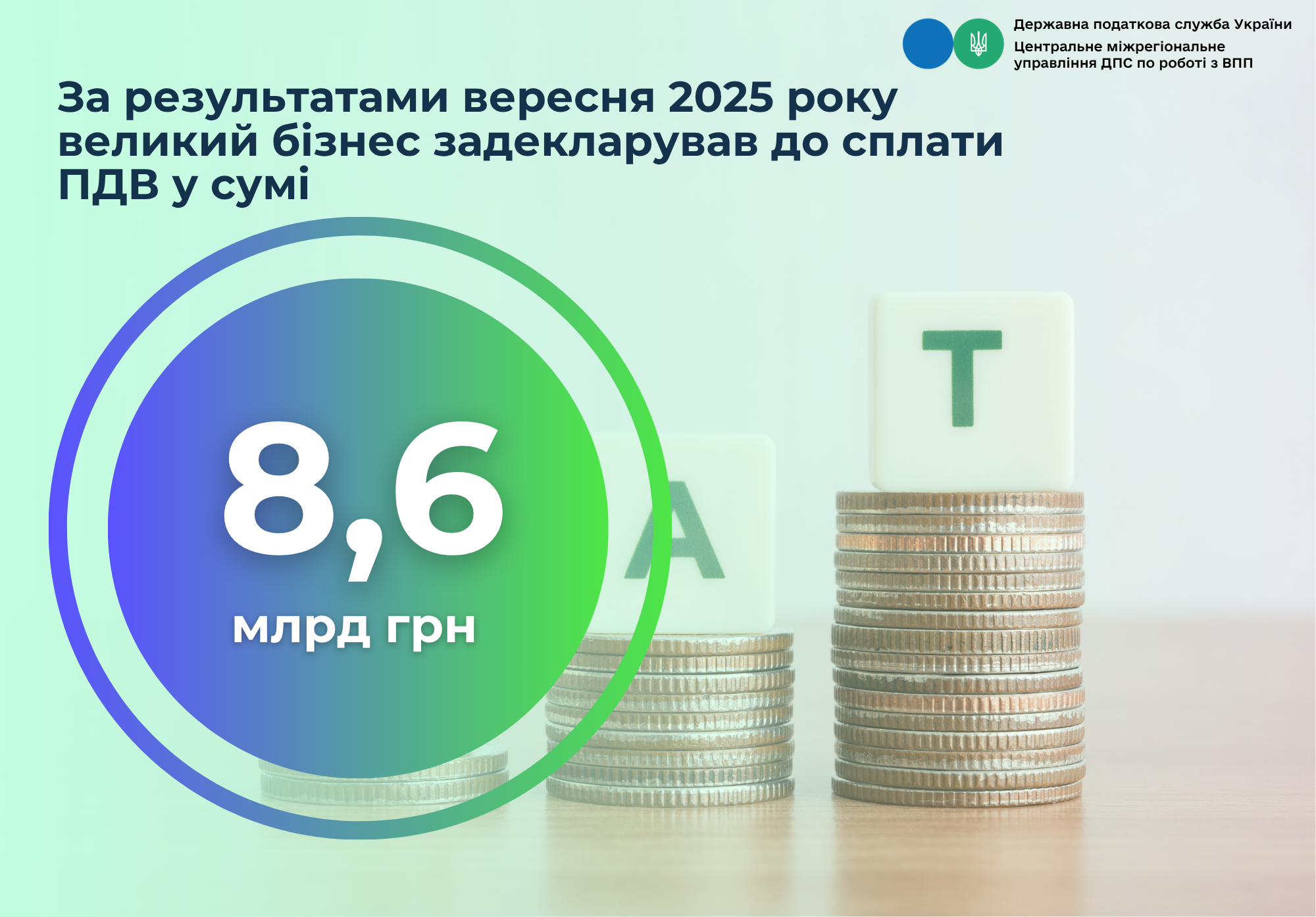 За результатами фінансово-господарської діяльності вересня 2025 року платниками Центрального міжрегіонального управління ДПС по роботі з великими платниками податків задекларовано до сплати 8 568,5 млн грн податку на додану вартість. За грудень 2024 – вересень 2025 року задекларовано до сплати 111417,4 млн грн податку на додану вартість, що на 7 364,6 млн грн або на 7,1% більше аналогічного періоду минулого року.