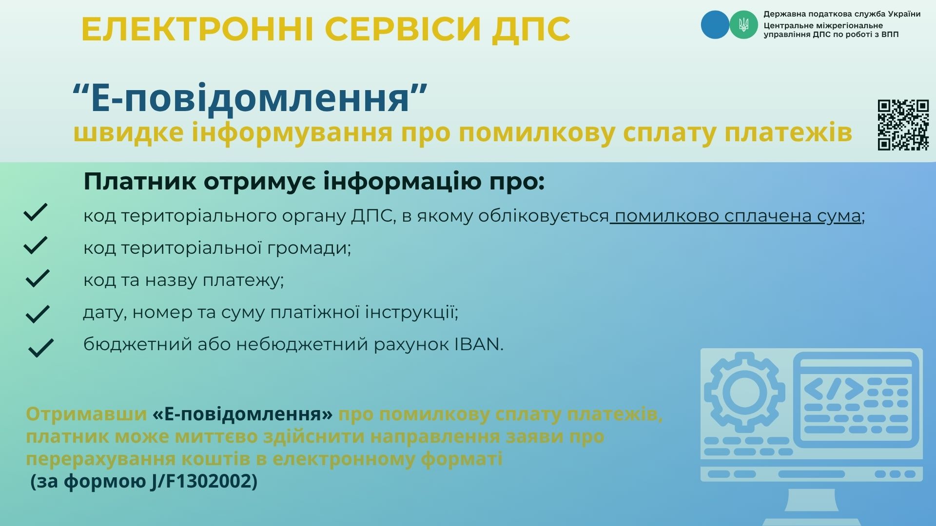 Центральне міжрегіональне управління ДПС по роботі з великими платниками податків інформує, що платники податків, користувачі електронного кабінету, мають можливість отримувати в розділі Вхідні/вихідні документи / Вхідні / Повідомлення електронне інформаційне повідомлення про помилкову сплату платежів та миттєво здійснювати направлення до територіального органу ДПС, в якому обліковуються такі суми, заяву про перерахування коштів в електронному форматі.