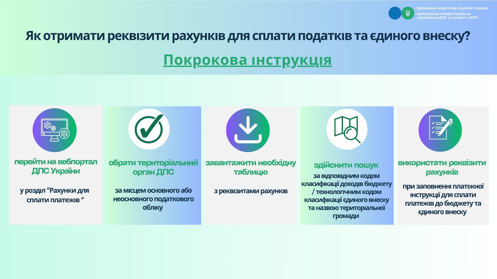 Своєчасне доведення платникам податків реквізитів рахунків для сплати податків, зборів та платежів, відкритих Державною казначейською службою України, відбувається шляхом їх розміщення в Центрах обслуговування платників податків, на офіційному вебпорталі відповідного територіального органу ДПС або на вебпорталі ДПС за посиланням: Головна/Рахунки для сплати платежів (https://tax.gov.ua/rahunki-dlya-splati-platejiv/).