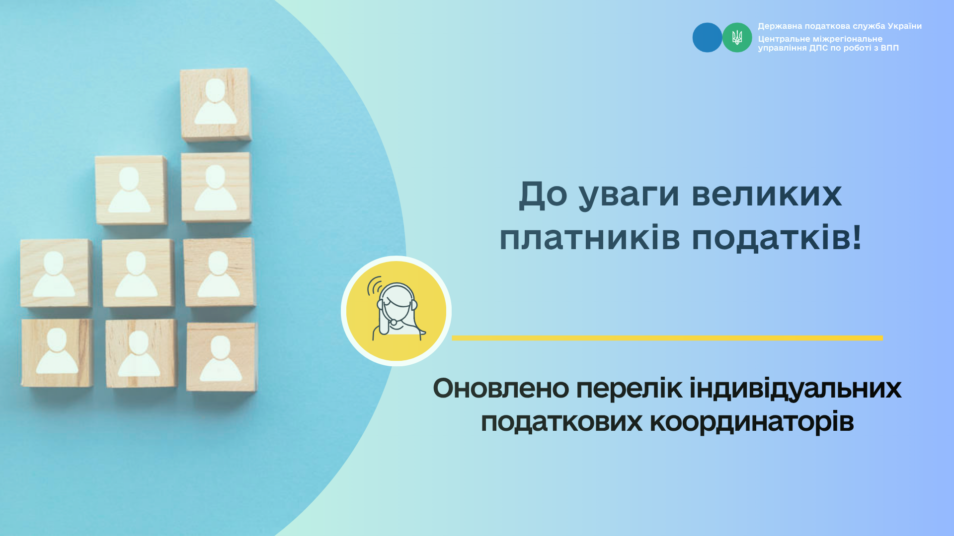 Центральне міжрегіональне управління ДПС по роботі з великими платниками податків інформує про оновлення переліку індивідуальних податкових координаторів.