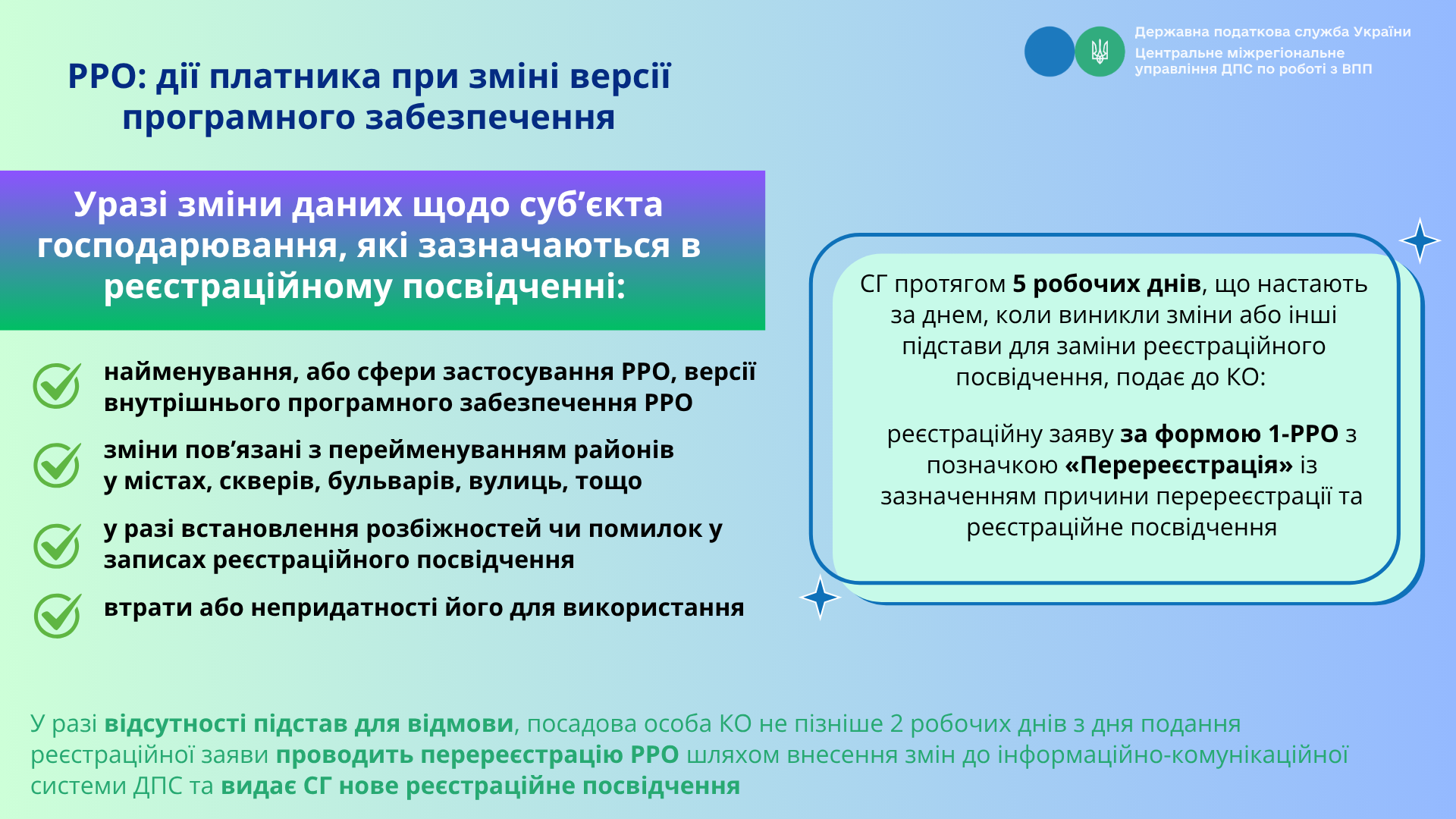 Центральне міжрегіональне управління ДПС по роботі з великими платниками податків інформує, що відповідно до п. 2 глави 3 розд. II Порядку реєстрації та застосування реєстраторів розрахункових операцій, що застосовуються для реєстрації розрахункових операцій за товари (послуги), затвердженого наказом Міністерства фінансів України від 14.06.2016 № 547 із змінами та доповненнями (далі – Порядок), РРО у разі зміни даних щодо суб’єкта господарювання, які зазначаються в реєстраційному посвідченні:  найменування, або сфери застосування РРО, версії внутрішнього програмного забезпечення РРО, а також у разі встановлення розбіжностей чи помилок у записах реєстраційного посвідчення, втрати або непридатності його для використання; зміни пов’язані з перейменуванням районів у містах, скверів, бульварів, вулиць, тощо, суб’єкт господарювання протягом п’яти робочих днів, що настають за днем, коли виникли зміни або інші підстави для заміни реєстраційного посвідчення, подає до контролюючого органу: реєстраційну заяву за формою 1-РРО з позначкою «Перереєстрація» із зазначенням причини перереєстрації та  реєстраційне посвідчення.