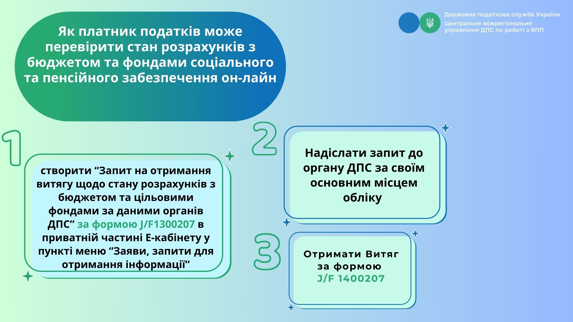 Для отримання витягу щодо стану розрахунків з бюджетом та цільовими фондами платник податків надсилає до органу ДПС за основним (неосновним) місцем обліку запит за формою «F/J1300207» через меню «Заяви, запити для отримання інформації» приватної частини Електронного кабінету.