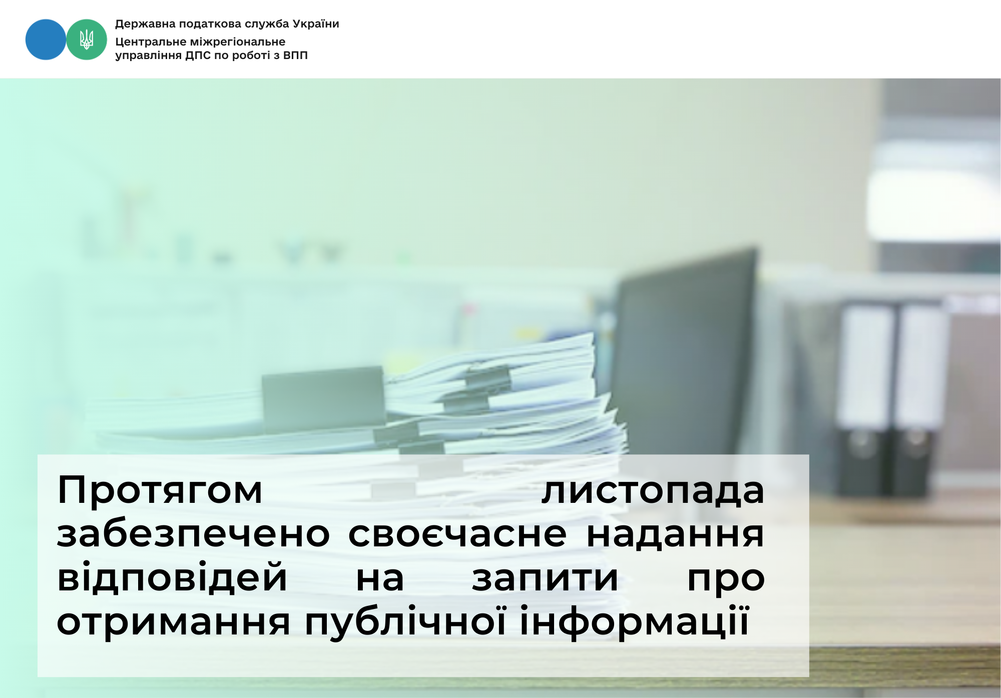 Протягом листопада 2025 року Центральним міжрегіональним управлінням ДПС по роботі з великими платниками податків отримано та забезпечено своєчасне надання відповідей на 4 запити про отримання публічної інформації; за відповідний період 2024 року - 6 запитів.