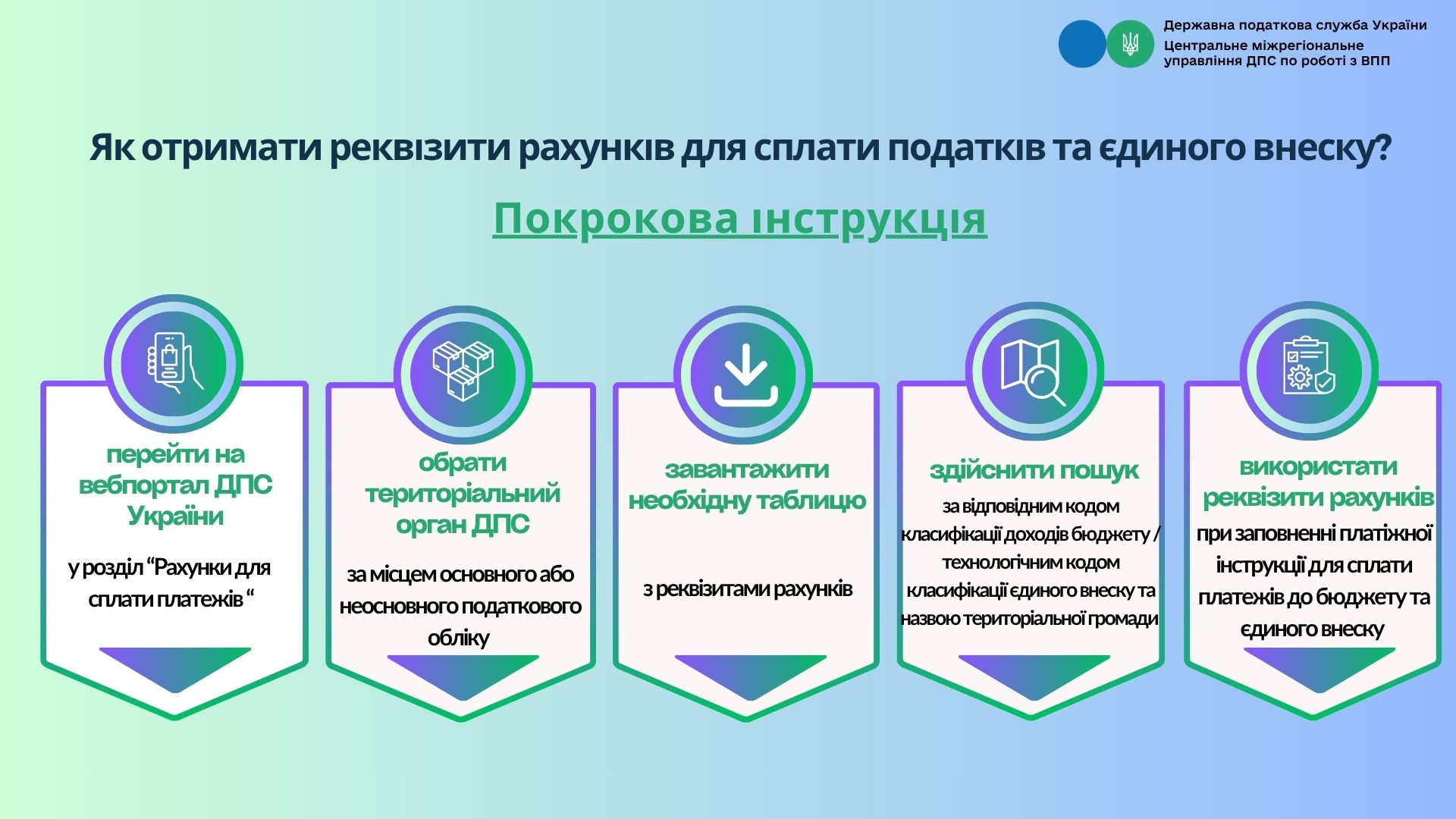 Своєчасне доведення платникам податків реквізитів рахунків для сплати податків, зборів та платежів, відкритих Державною казначейською службою України, відбувається шляхом їх розміщення в Центрах обслуговування платників податків, на офіційному вебпорталі відповідного територіального органу ДПС або на вебпорталі ДПС за посиланням: Головна/Рахунки для сплати платежів https://tax.gov.ua/rahunki-dlya-splati-platejiv/.