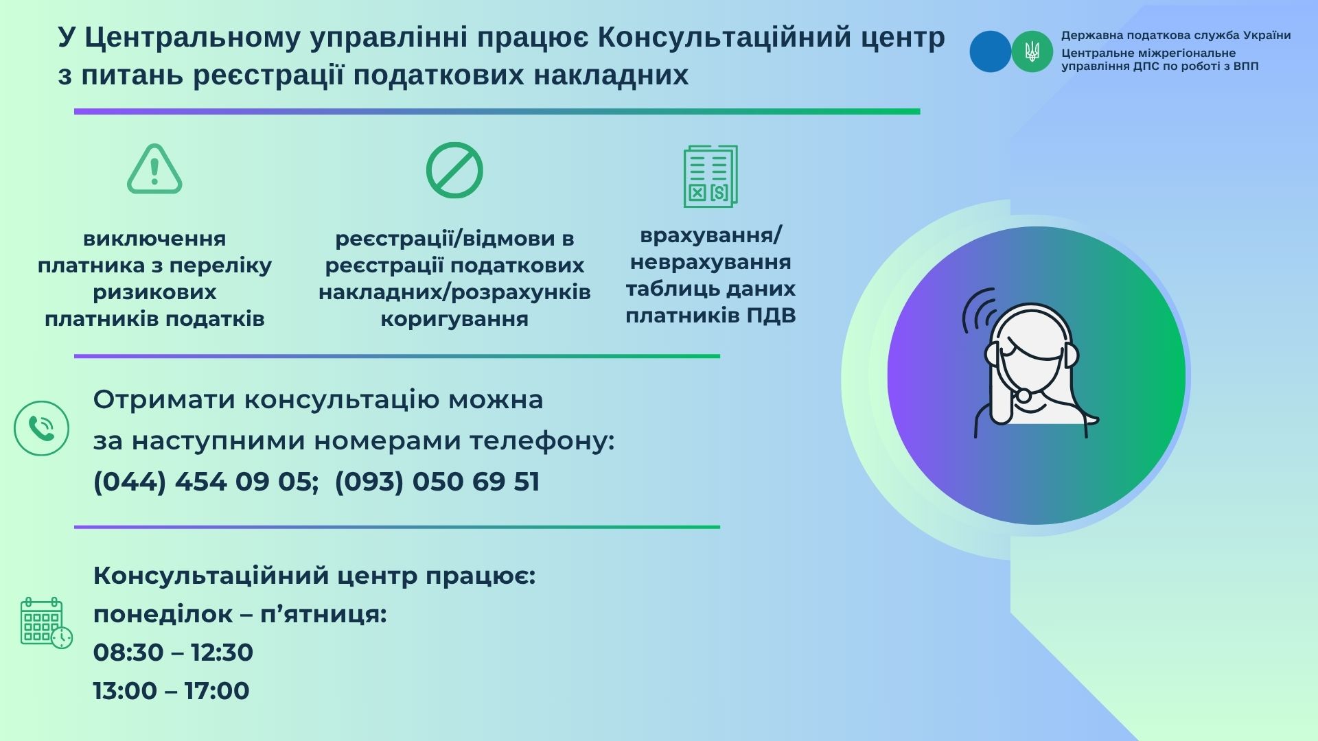 Нагадуємо, що у Центральному міжрегіональному управлінні ДПС по роботі з великими платниками податків працює Консультаційний центр з питань реєстрації податкових накладних для вирішення проблемних питань в частині виключення платника з переліку ризикових платників податків, реєстрації/відмови в реєстрації податкових накладних/розрахунків коригування та врахування/неврахування таблиць даних платників ПДВ.