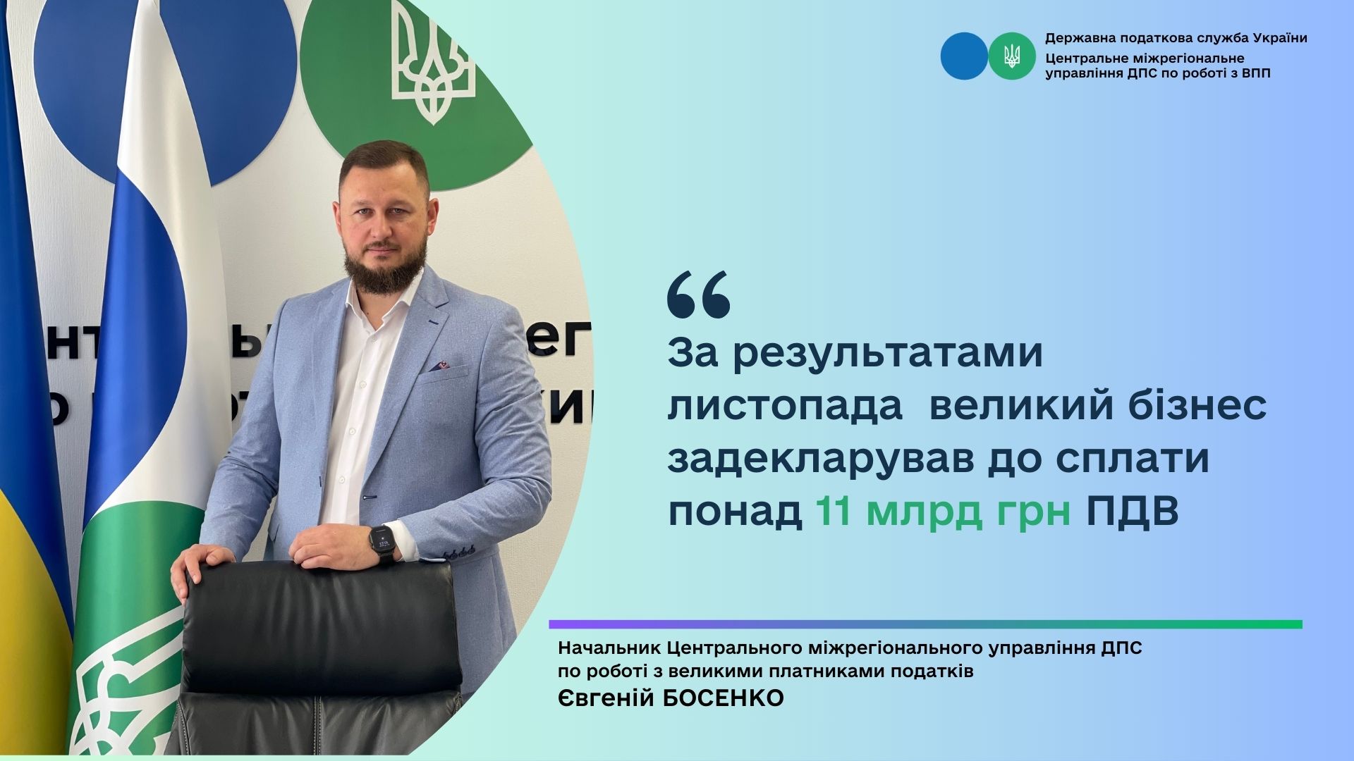 За результатами фінансово-господарської діяльності листопада 2025 року платниками Центрального міжрегіонального управління ДПС по роботі з великими платниками податків задекларовано до сплати 11 037,0 млн грн податку на додану вартість, що більше жовтня 2025 року на 1 440,5 млн грн, або на 15 відсотків (декларація за жовтень 2025 року – 9 596,5 млн гривень). За грудень 2024 – листопад 2025 року задекларовано до сплати 132 444,7 млн грн податку на додану вартість, що на 5 361,4 млн грн або на 4,0% більше аналогічного періоду минулого року. Про це повідомив начальник Центрального міжрегіонального управління ДПС по роботі з великими платниками податків Євгеній Босенко.
