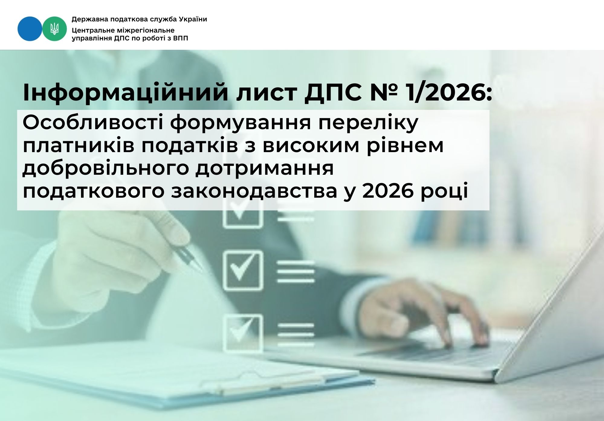 Центральне міжрегіональне управління ДПС по роботі інформує, що з 1 січня 2026 року в Україні діють оновлені норми Податкового кодексу, що стосуються формування Переліку платників податків з високим рівнем добровільного дотримання законодавства.