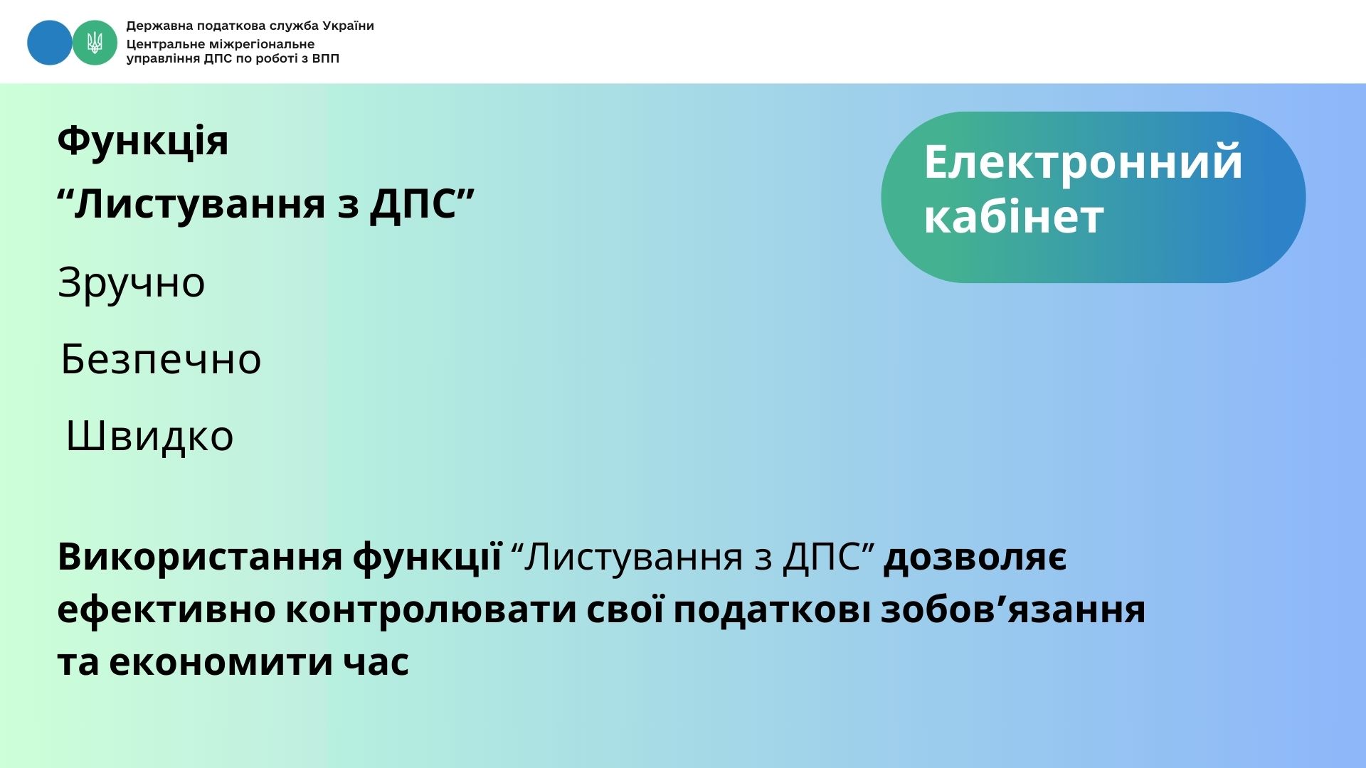 Скориставшись функцією «Листування з ДПС» Електронного кабінету платника податків, ви отримуєте зручний, безпечний та швидкий спосіб обміну інформацією з податковою службою, що дозволяє ефективно контролювати свої податкові зобов’язання та економити час.