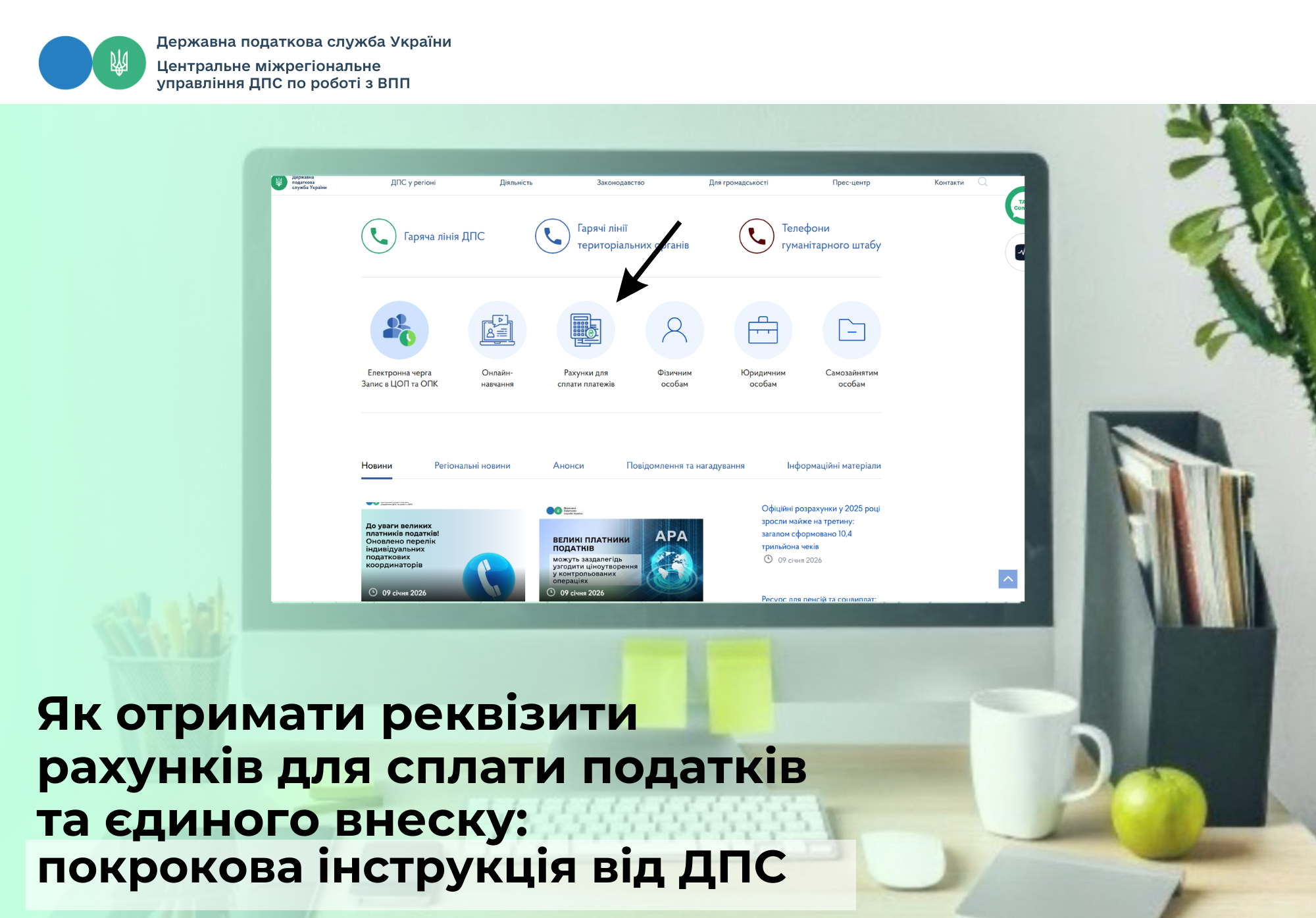 Центральне міжрегіональне управління ДПС по роботі з великими платниками податків нагадує, що інформацію про реквізити рахунків, відкритих для зарахування податків, а також для сплати єдиного внеску платники податків можуть отримати у рубриці «Рахунки для сплати платежів» на вебпорталі ДПС.