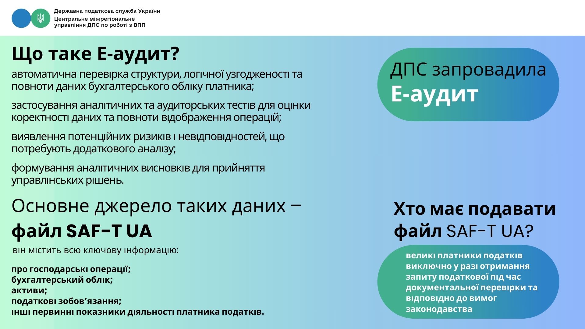Центральне міжрегіональне управління ДПС по роботі з великими платниками податків нагадує, що з 1 січня 2026 року в Україні запрацювала система електронного аудиту – Е-аудит. Це сучасний цифровий інструмент податкового контролю. Він сприятиме ще більшій прозорості у відносинах між бізнесом та податковою.