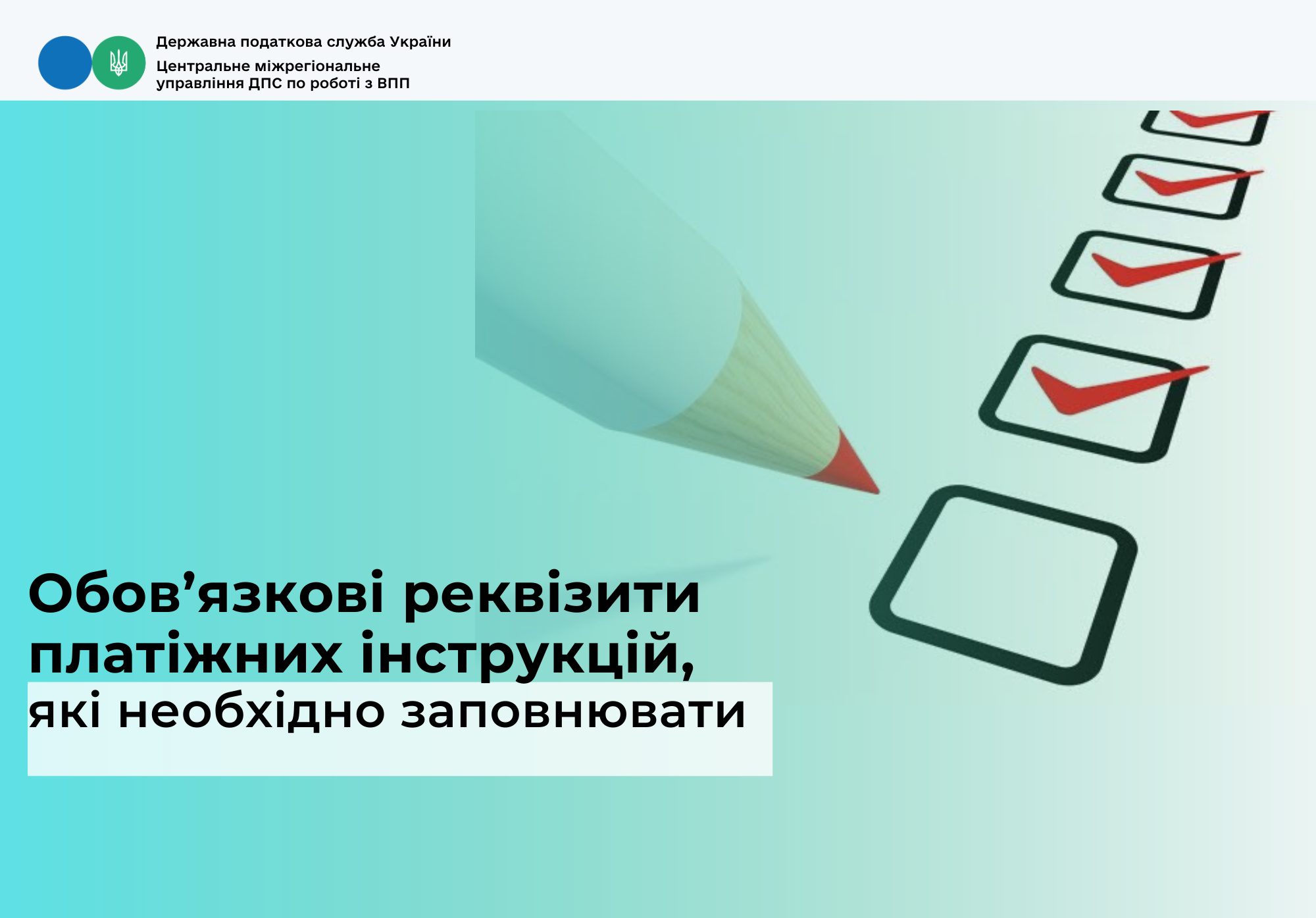 Центральне міжрегіональне управління ДПС по роботі з великими платниками податків звертає увагу платників податків, що правильне заповнення обов’язкових реквізитів платіжних інструкцій, у т. ч. структурованого формату реквізиту «Призначення платежу», є актуальним, оскільки Національним банком України з 01 грудня 2023 року впроваджено використання надавачами платіжних послуг та платниками податків виключно структурованого формату такого реквізиту згідно з міжнародним стандартом ISO 20022 (постанова Правління Національного банку України від 16.09.2021 № 93).