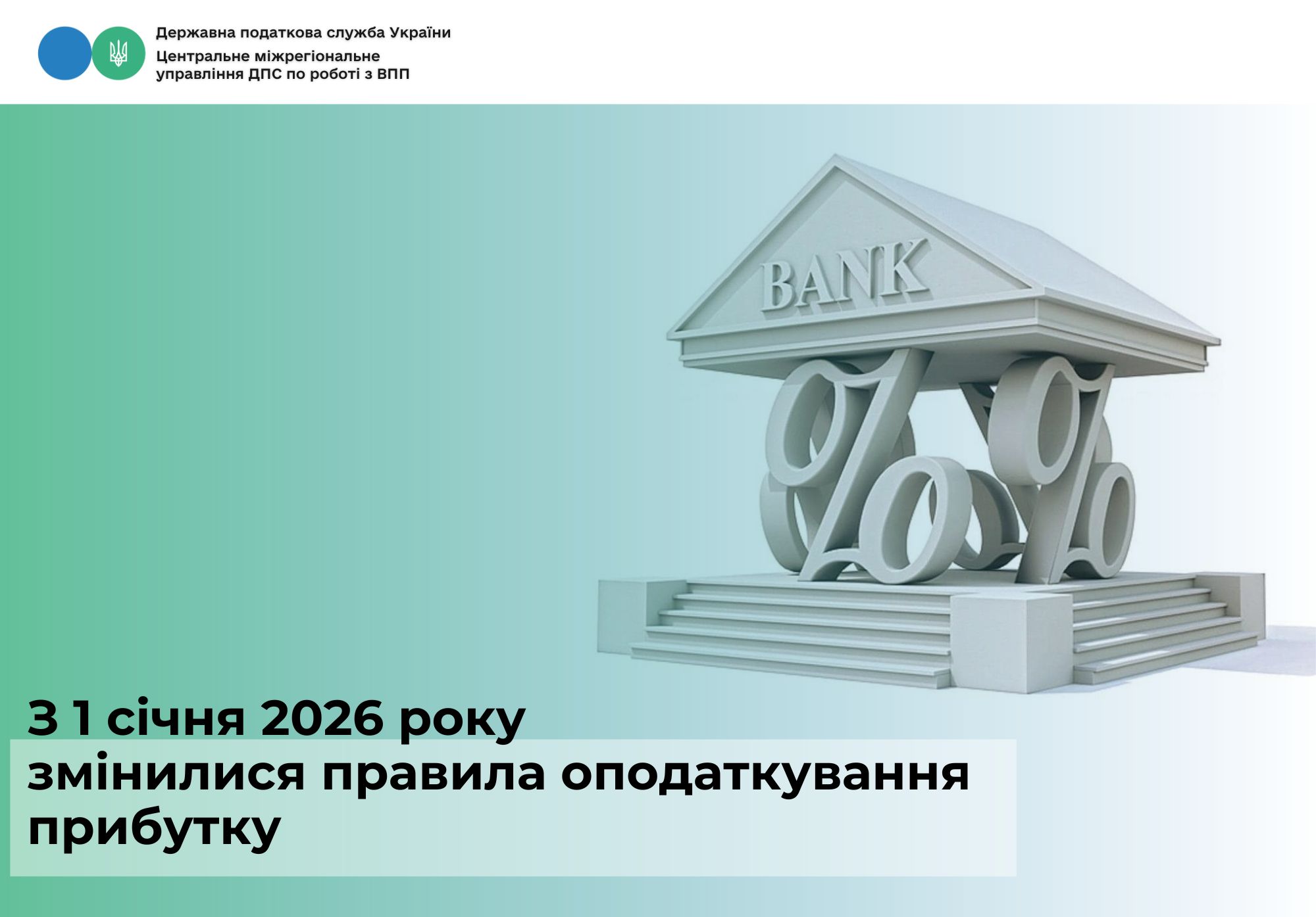 Центральне міжрегіональне управління ДПС по роботі з великими платниками податків нагадує, що з початку 2026 року для банків запроваджено нові податкові умови, які впливають як на ставку податку на прибуток, так і на порядок врахування збитків минулих років.