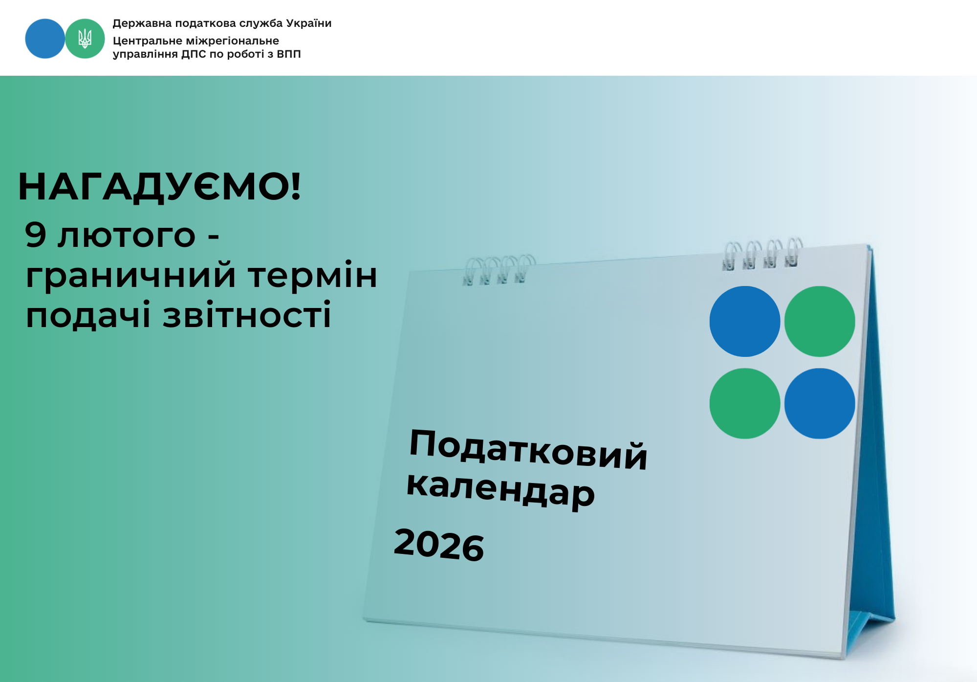 Центральне міжрегіональне управління ДПС по роботі з великими платниками податків нагадує платникам податків, що 9 лютого 2026 року - це граничний термін подання наступної податкової звітності за ІV квартал 2025 року: