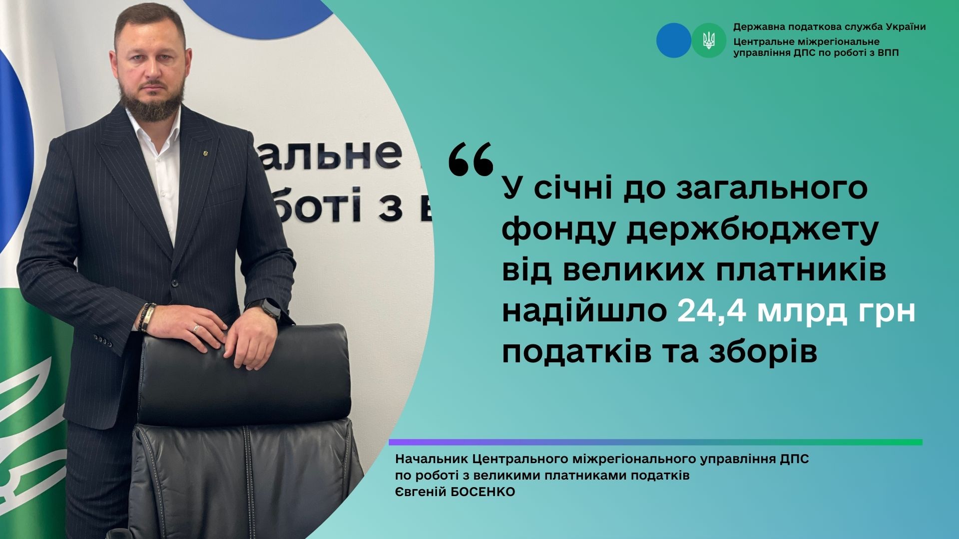 Протягом січня 2026 року платниками Центрального управління забезпечено збір платежів до загального фонду Державного бюджету в розмірі 24,4 млрд грн, що на 3,4% або на 0,8 млрд грн більше ніж у січні 2025 року. Про це розповів начальник Центрального міжрегіонального управління ДПС по роботі з великими платниками податків Євгеній Босенко.
