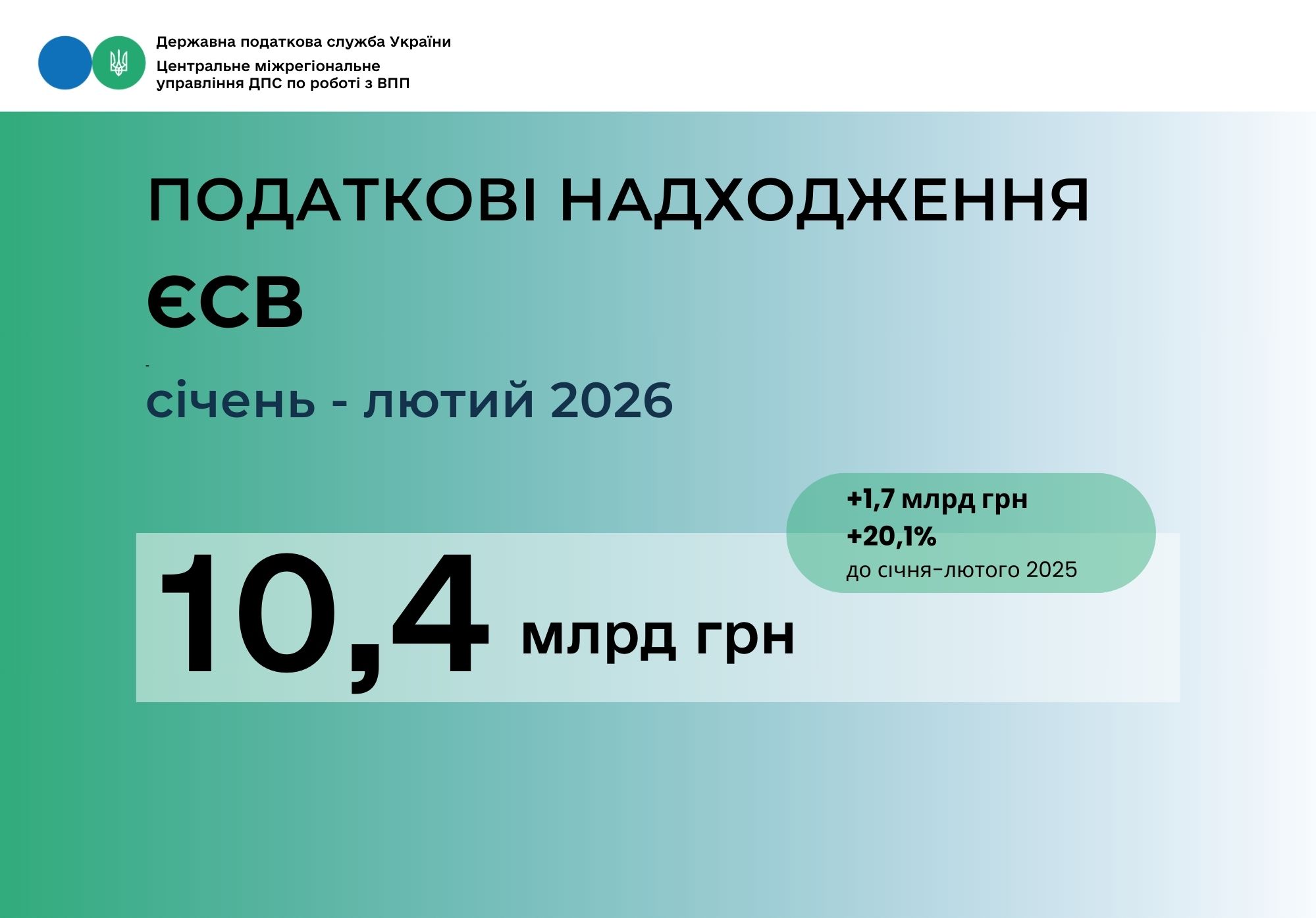 За січень-лютий 2026 року великі підприємства, що перебувають на обліку у Центральному міжрегіональному управлінні ДПС по роботі з великими платниками податків, забезпечили стабільні надходження єдиного внеску на загальнообов’язкове державне соціальне страхування. Загальна сума сплаченого ЄСВ склала 10,4 млрд гривень.