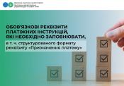 Центральне міжрегіональне управління ДПС по роботі з великими платниками податків звертає увагу платників податків, що правильне заповнення обов’язкових реквізитів платіжних інструкцій, у т. ч. структурованого формату реквізиту «Призначення платежу», є актуальним, оскільки Національним банком України з 01 грудня 2023 року впроваджено використання надавачами платіжних послуг та платниками податків виключно структурованого формату такого реквізиту згідно з міжнародним стандартом ISO 20022 (постанова Правління Національного банку України від 16.09.2021 № 93).