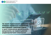 Центральне міжрегіональне управління ДПС по роботі з великими платниками звертає увагу на особливості подання першої податкової декларації з рентної плати (в частині рентної плати за користування радіочастотним спектром (радіочастотним ресурсом) України) СГ, який отримав дозвільний документ на користування радіочастотним спектром (радіочастотним ресурсом) (у т. ч., якщо користування радіочастотним спектром здійснюється в місяці наступному після отримання дозвільного документу).