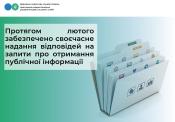 Протягом лютого 2026 року Центрального міжрегіонального управління ДПС по роботі з великими платниками податків отримано та забезпечено своєчасне надання відповідей на 6 запитів про отримання публічної інформації; за відповідний період 2025 року - 6 запитів.