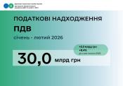 За січень-лютий 2026 року платниками Центрального міжрегіонального управління ДПС по роботі з великими платниками податків до державного бюджету спрямовано 30,0 млрд грн податку на додану вартість. Це більше на 2,3 млрд грн або 8,4 відс. ніж за 2 місяці 2025 року.