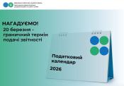 Центральне міжрегіональне управління ДПС по роботі з великими платниками податків нагадує платникам податків, що 20 березня 2026 року - це граничний термін подання наступної податкової звітності за лютий 2026 року: