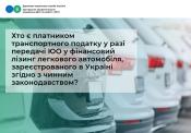 Враховуючи викладене, у разі передачі легкового автомобіля у фінансовий лізинг, платником транспортного податку щодо транспортних засобів, зареєстрованих в Україні згідно з чинним законодавством, є лізингодавець (юридична особа – власник транспортного засобу).